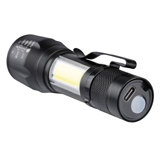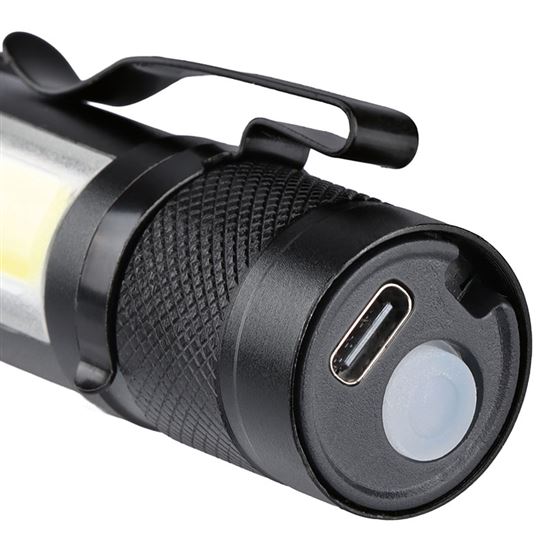 • LED kovové nabíjacie svietidlo s hlavným zdrojom svetla (150lm) a bočné LED COB (60lm)