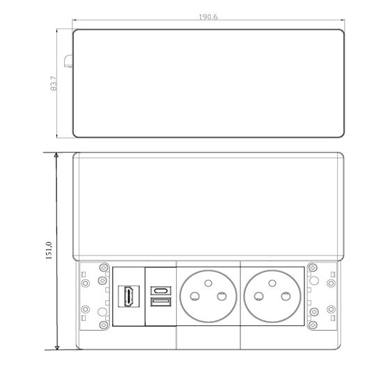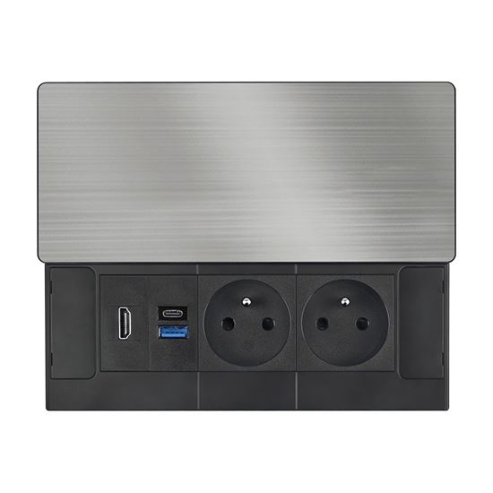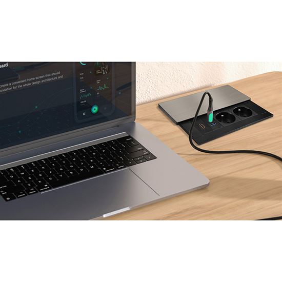 Tento vstavaný blok zásuviek ponúka viac ako len napájanie - kombinuje dve sieťové zásuvky 230 V, USB rýchlonabíjačku a HDMI port v jednom kompaktnom module. Vrchný kryt z matnej tmavej nerez ocele (inox) s posuvným mechanizmom sa ľahko začlení do moderného interiéru pracovných stolov, prezentačných priestorov aj obývacích izieb. Vďaka káblu s dĺžkou 2 metre je inštalácia flexibilná a pohodlná.